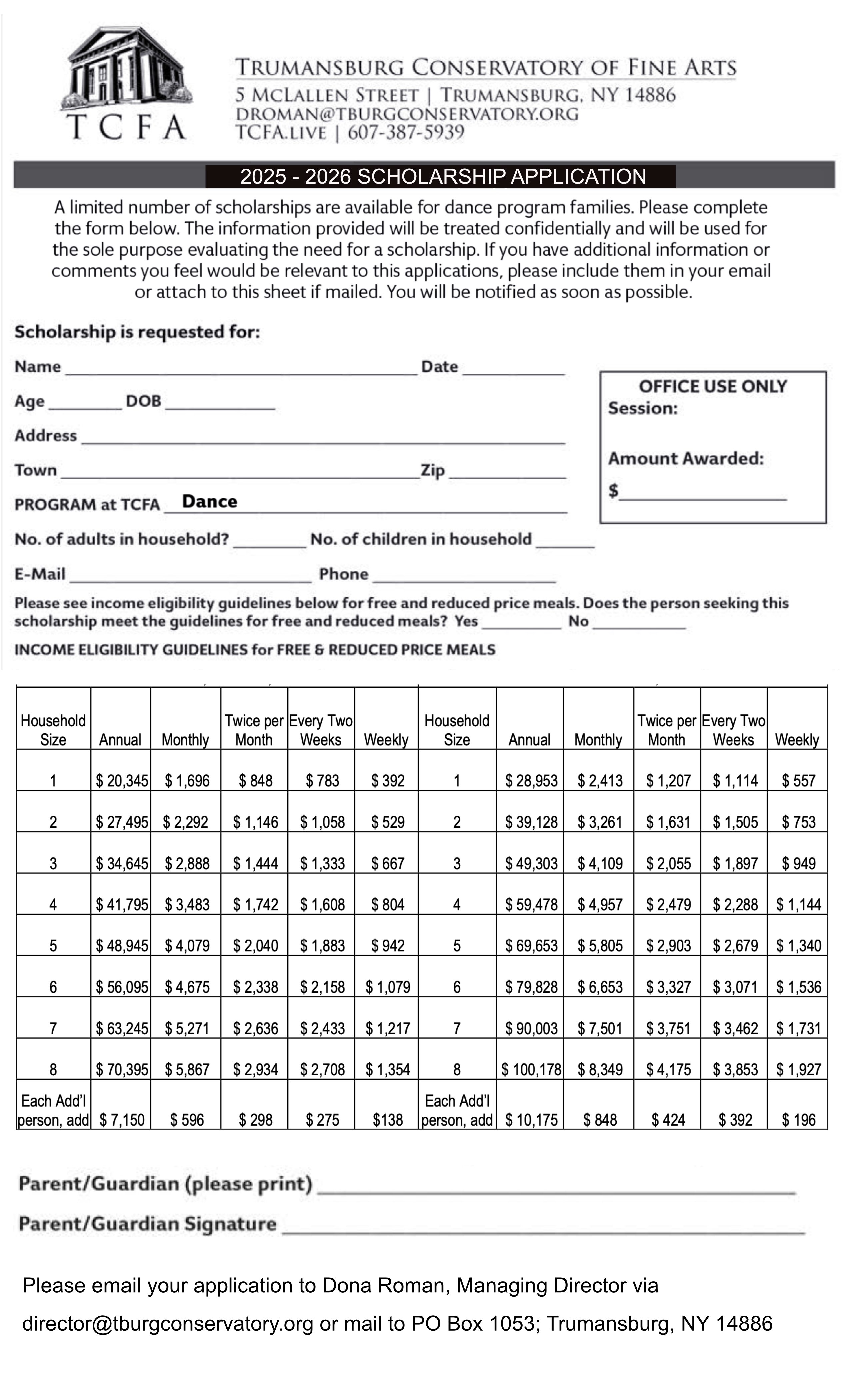 Requirement: Must have completed one (1) week of the Junior/Elite Competition Team Intensive over the Summer 2025. Must be currently enrolled (2025-2026) in three (3) weekly TCFA dance classes, specifically: Ballet IV, Jazz IV, and Elite Team Choreography.