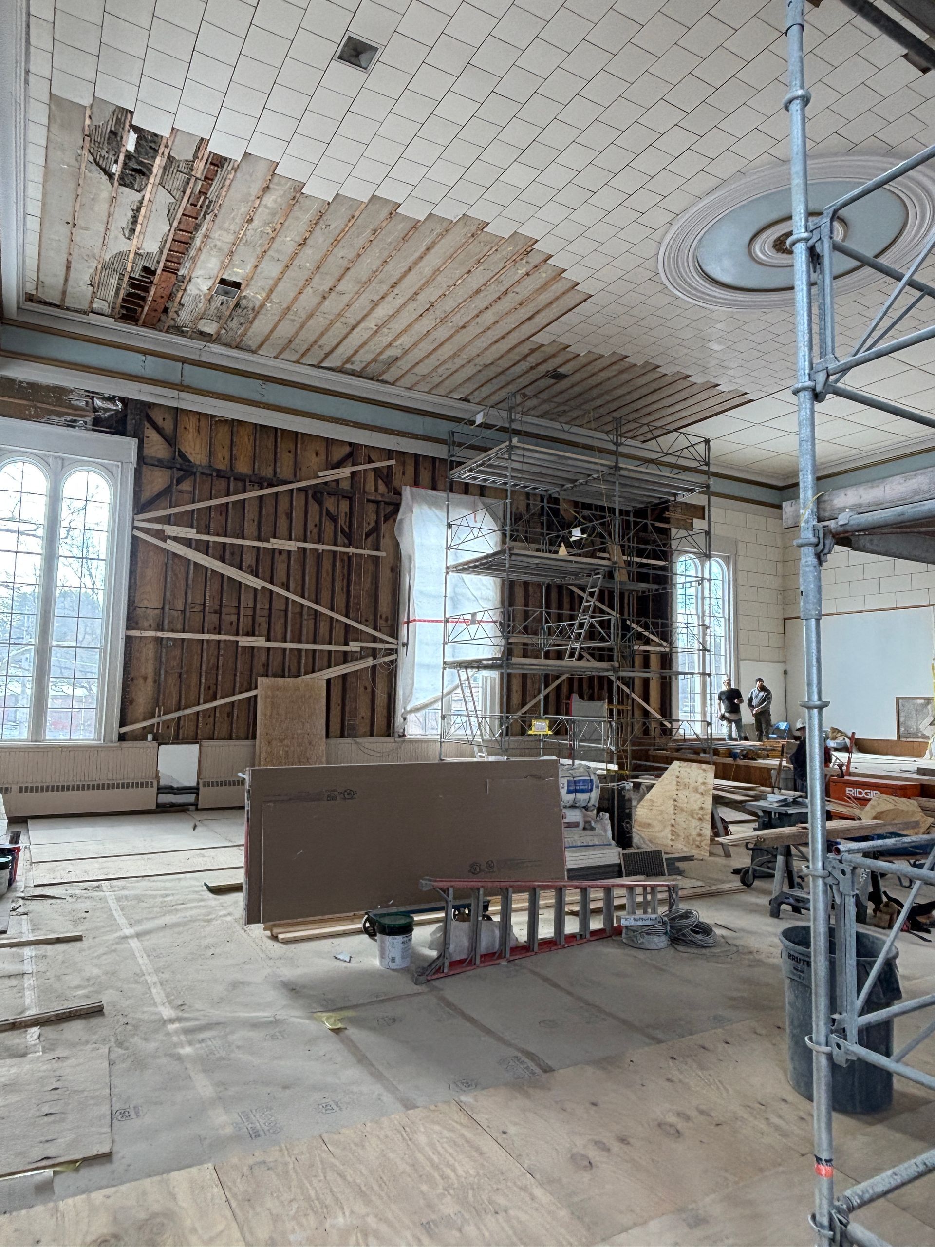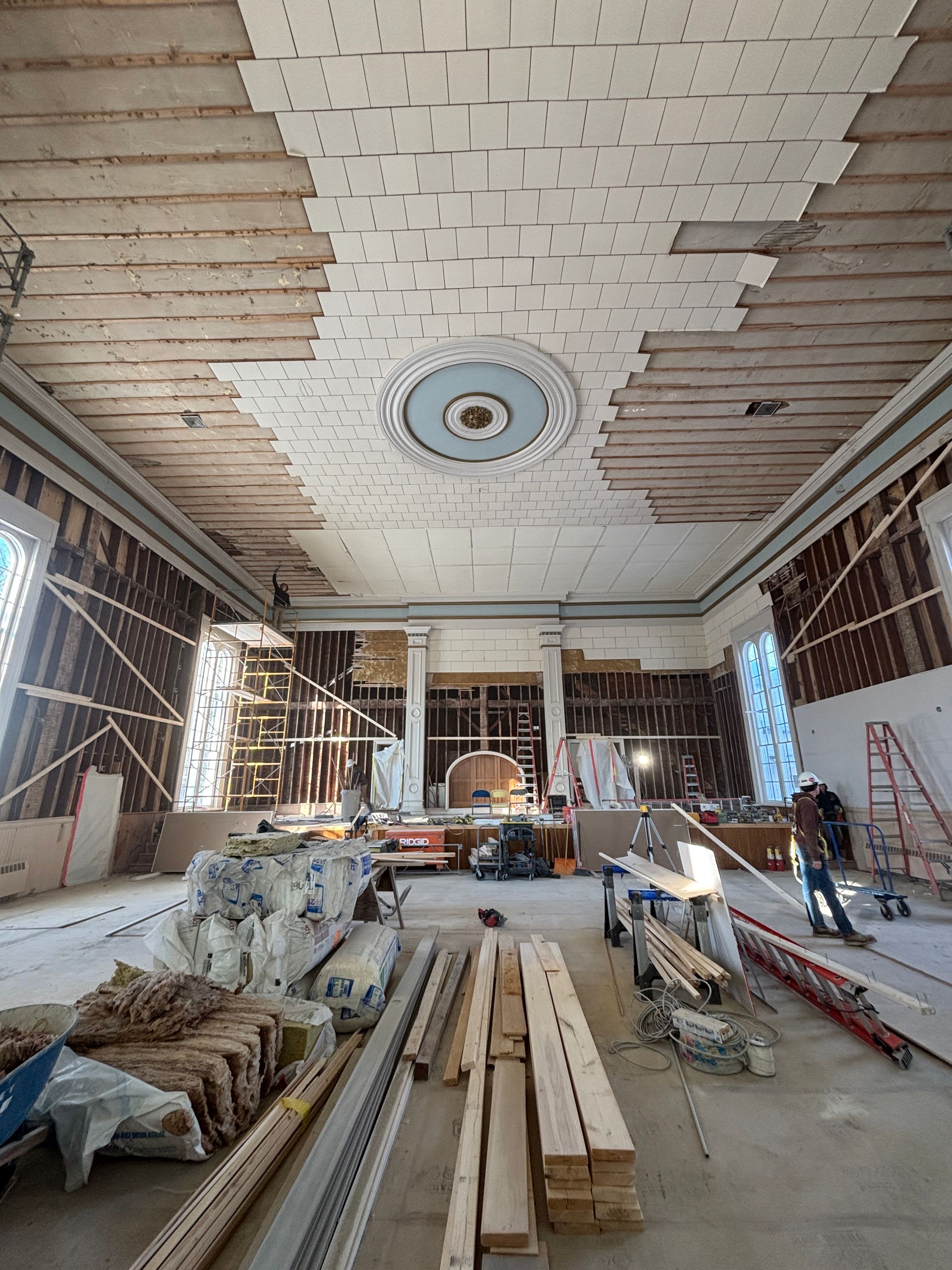 New walls, new acoustic ceiling panels, and fully insulated. Our main hall is ready for painting, fixtures, floor restoration, woodworking, and the many finishing touches.